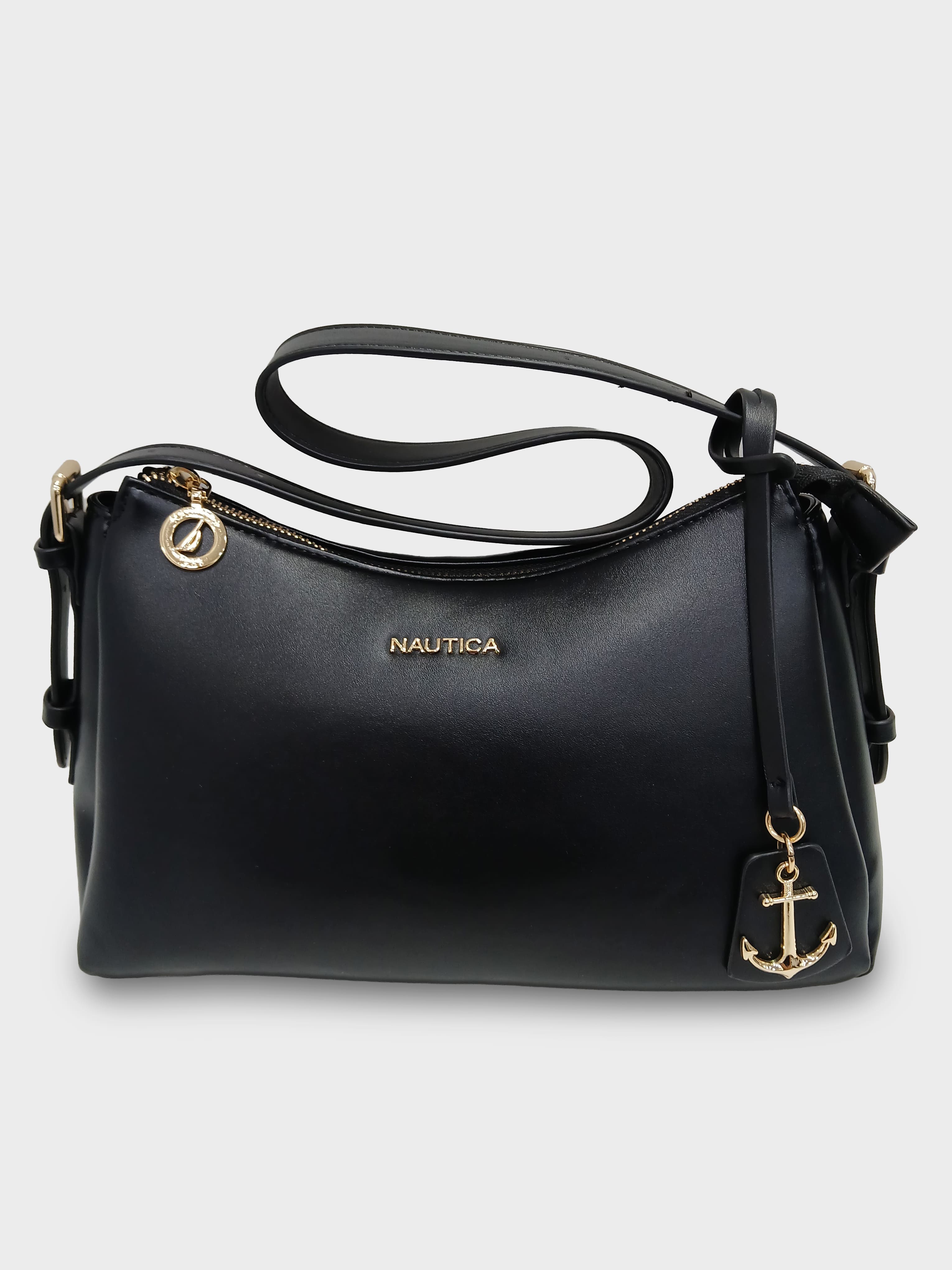 This shoulder bag defines minimalist elegance, designed with a chic, gently curved silhouette. Its smooth, refined finish and sleek design make it a versatile piece for day or night. Finished with a subtle gold-tone anchor charm, this accessory offers timeless style and a comfortable, close fit under the arm.