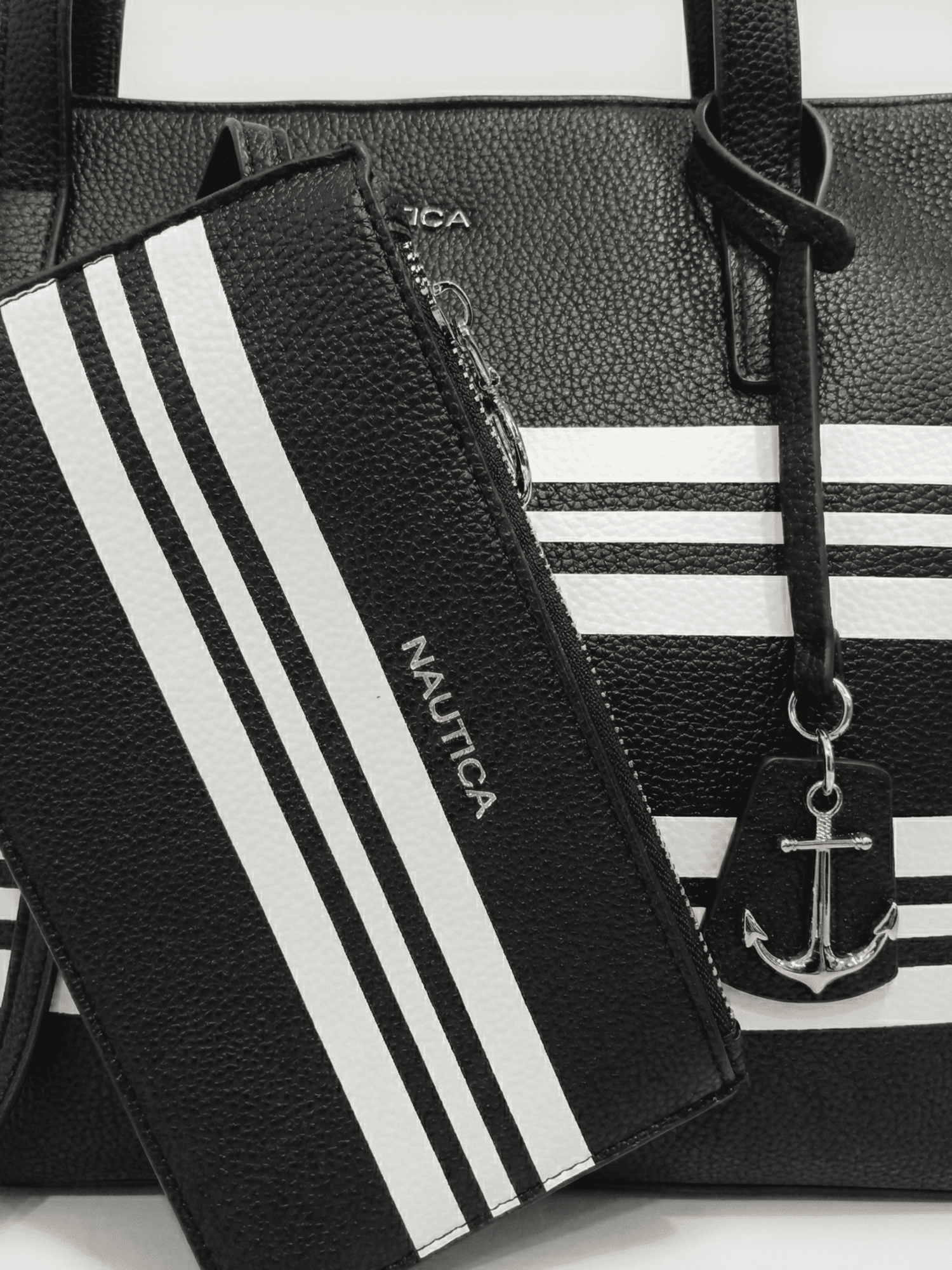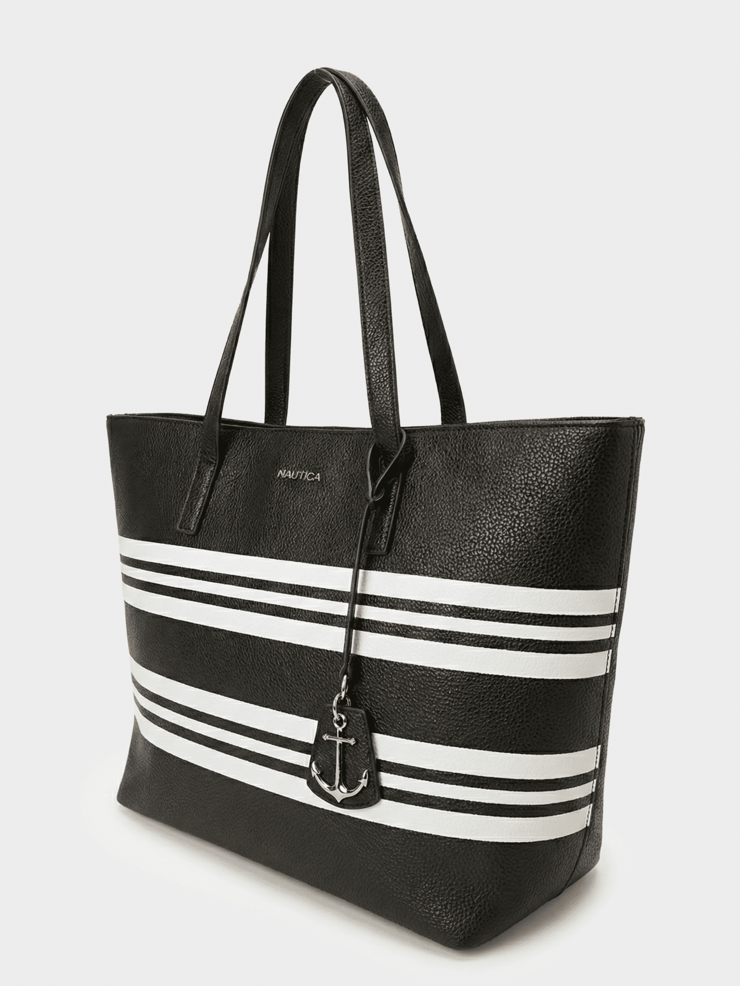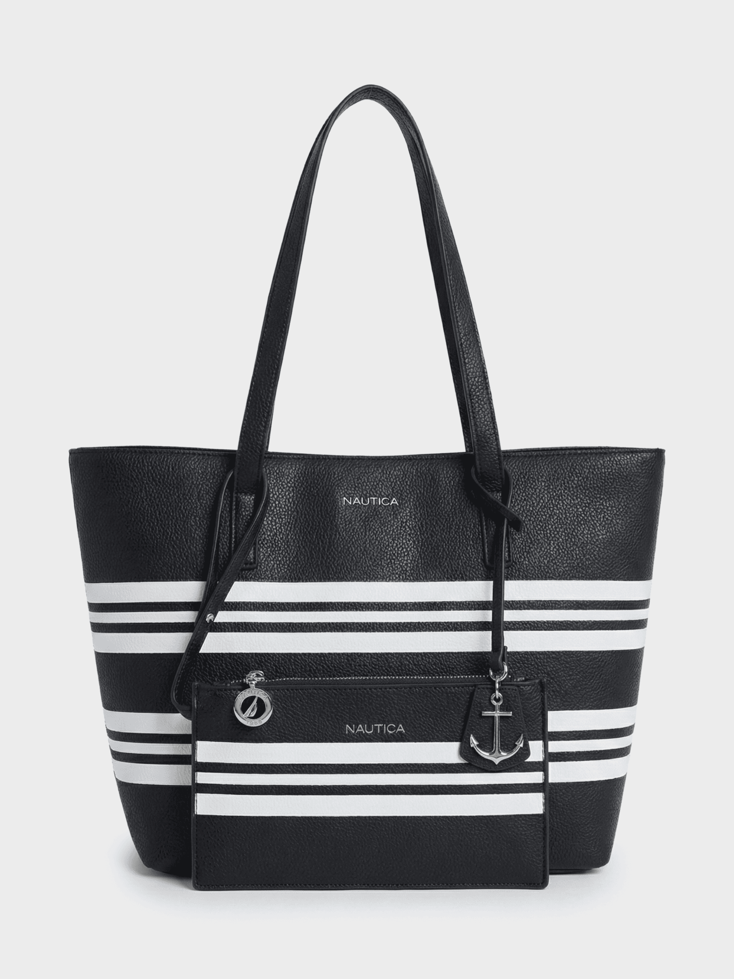 This spacious and chic tote is an essential for any collection. Featuring striking NAUTICA signature stripes across a textured grain finish, it perfectly captures timeless nautical elegance. Designed for convenience, the interior includes an essential removable pouch to keep your smaller items organized. Perfect for every adventure, this bag delivers refined style and effortless capacity.