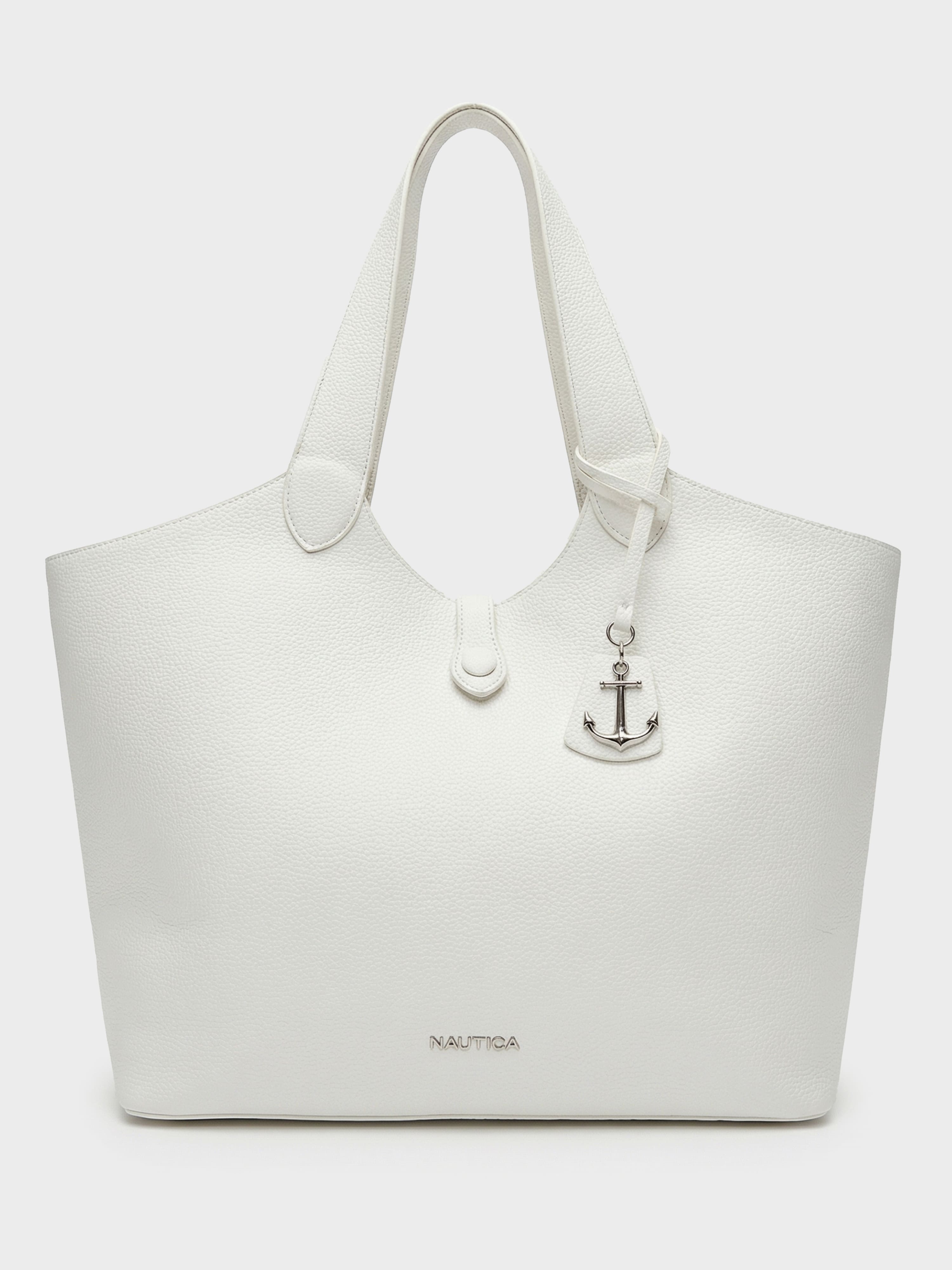 The ultimate accessory for storage and style. This generously sized tote offers a sophisticated look in a textured grain finish, perfect for your everyday essentials. It is thoughtfully designed with an included small pouch to keep your valuable items organized and secure. Finished with a signature Nautica anchor charm, this piece provides effortless capacity and enduring style.
