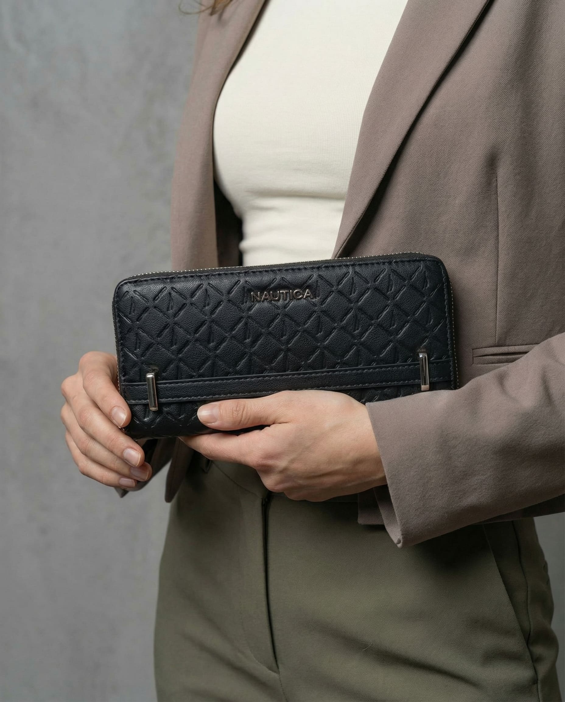 A sophisticated wallet featuring the interlocked J-Class pattern embossed across the exterior for a rich, textured finish. Designed for maximum security and organization, the full zip-around closure keeps your cards and cash securely contained, offering polished, enduring elegance in a functional silhouette.