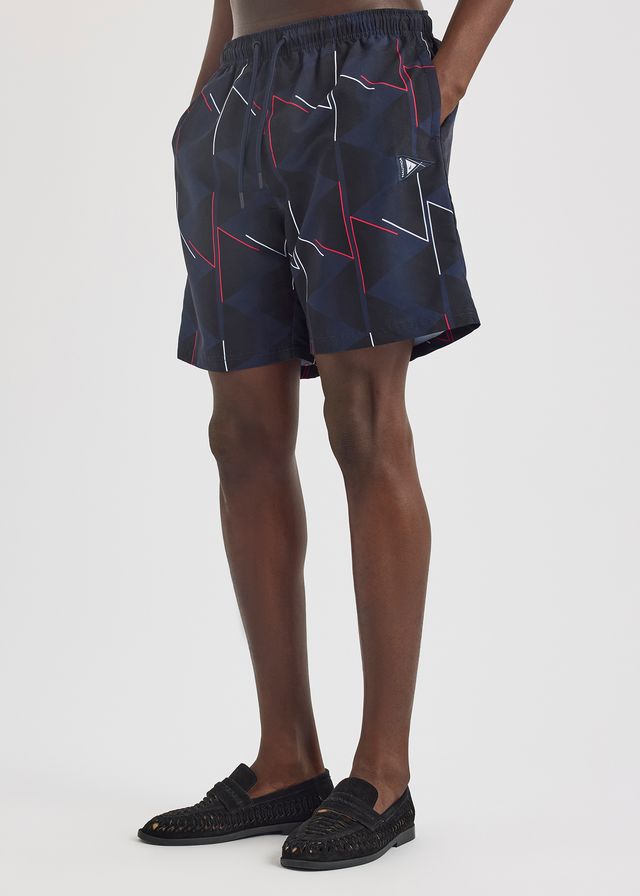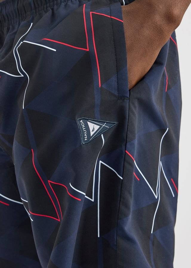 The Mazu 7" Swim Short. Performance swim short designed with a modern geometric print and optimal 7-inch inseam for contemporary styling. Crafted from quick-drying polyester microfibre that delivers superior comfort and functionality in and out of the water. Features practical drawstring waistband and sleek silhouette that transitions seamlessly from beach to boardwalk with effortless versatility.
