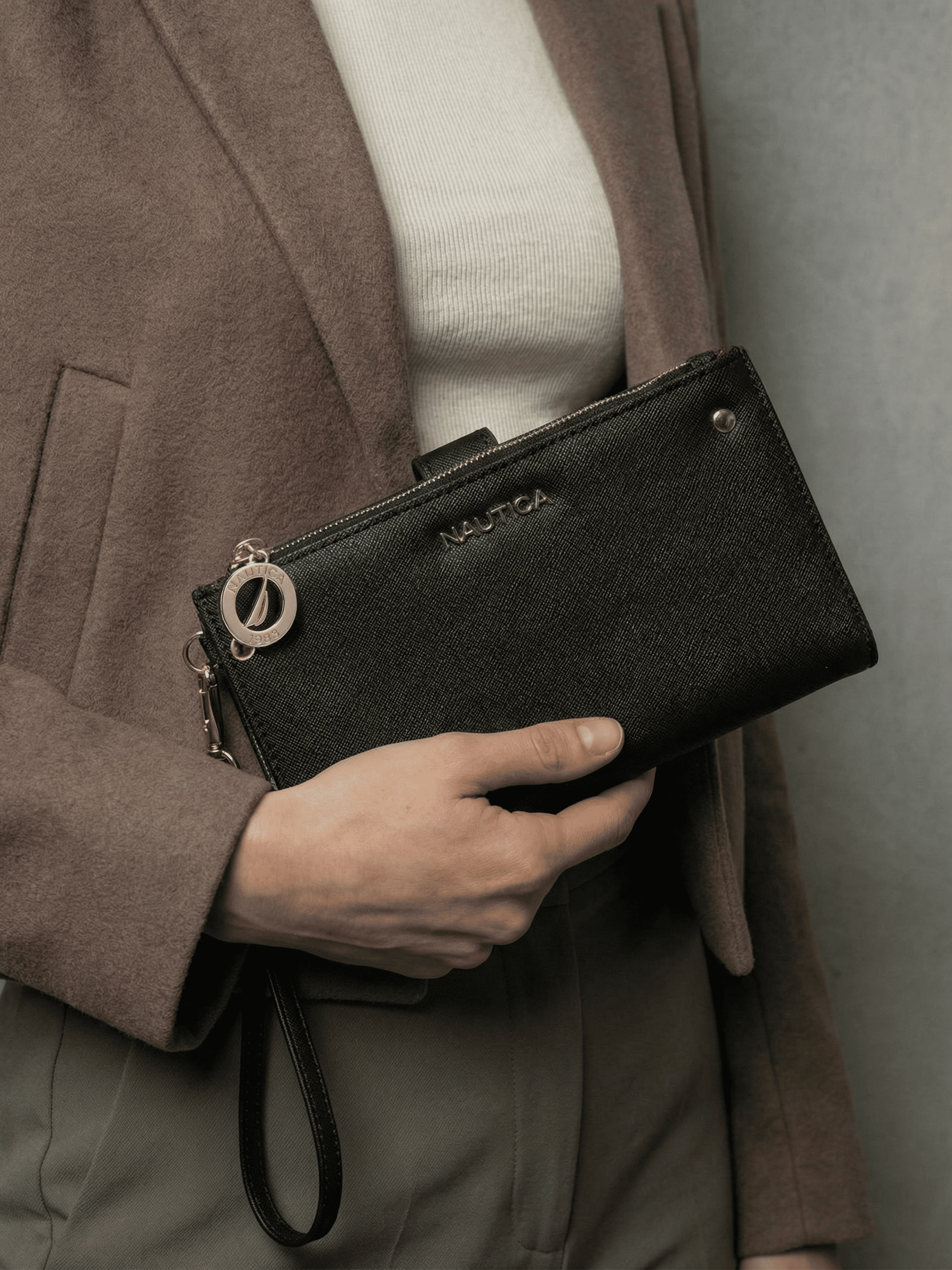 A versatile accessory designed for the on-the-go lifestyle. This clutch wallet features a striking two-tone exterior and a secure wristlet strap for hands-free carrying. The highly organized interior provides ample space for cards, cash, and phone, combining essential functionality with clean, sophisticated style.