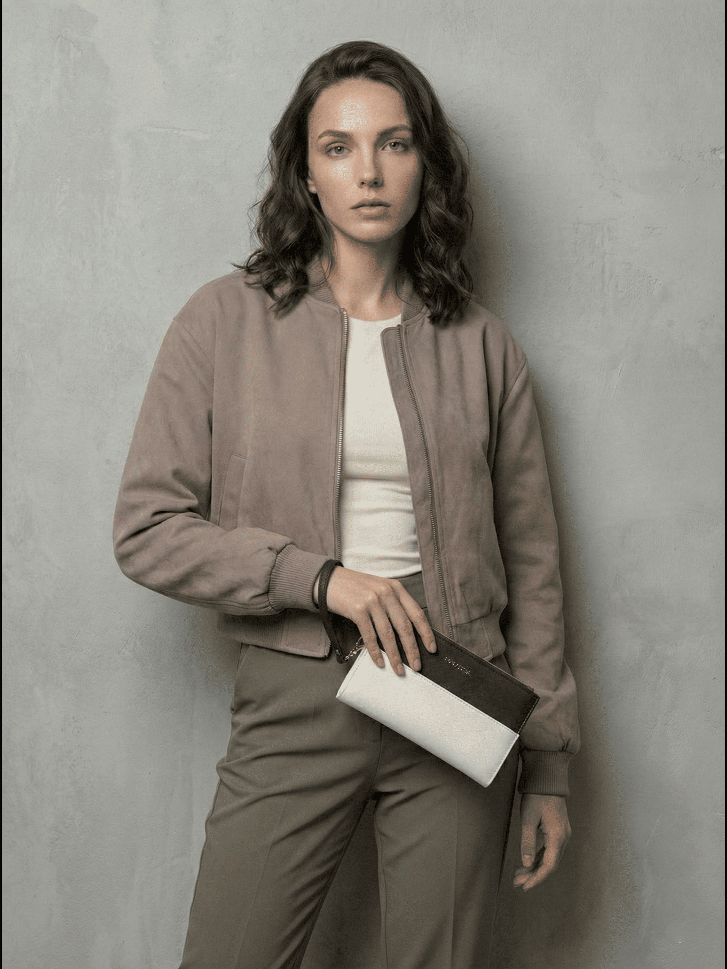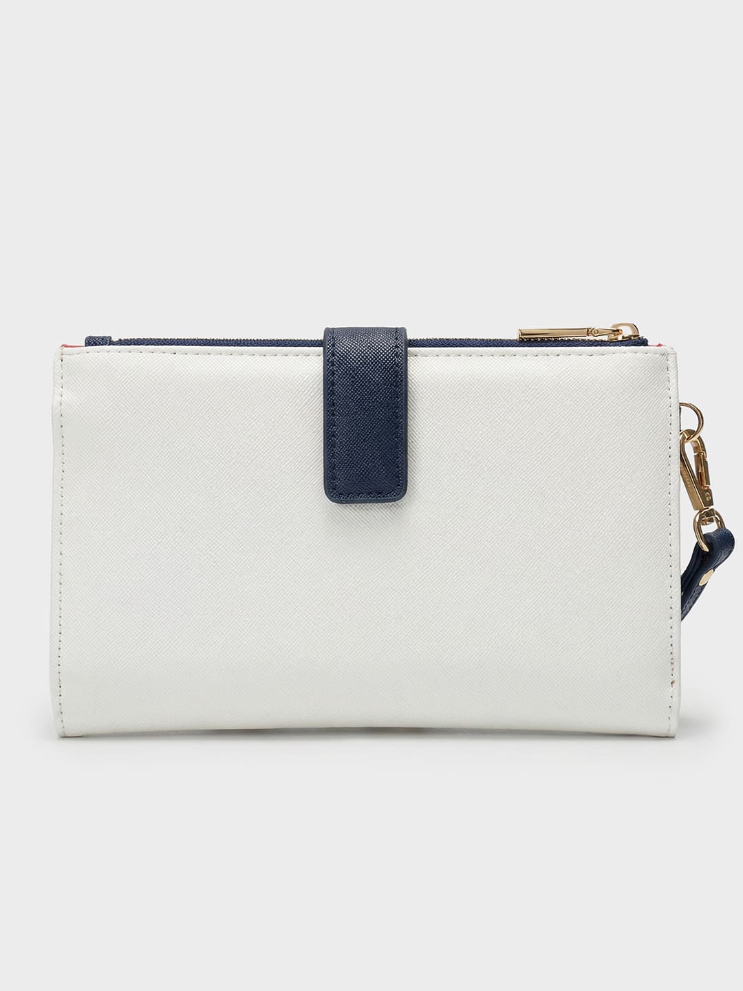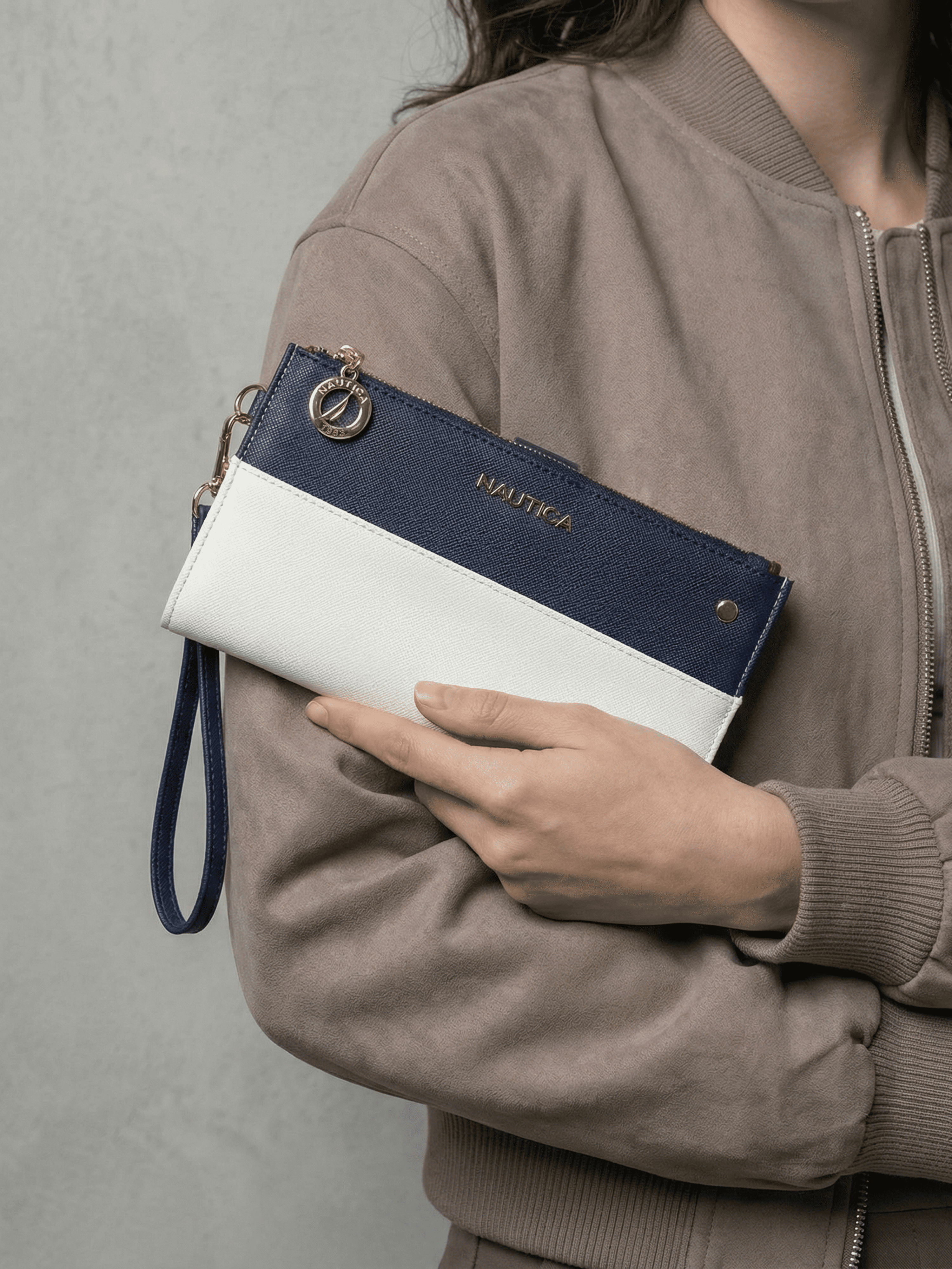 A versatile accessory designed for the on-the-go lifestyle. This clutch wallet features a striking two-tone exterior and a secure wristlet strap for hands-free carrying. The highly organized interior provides ample space for cards, cash, and phone, combining essential functionality with clean, sophisticated style.